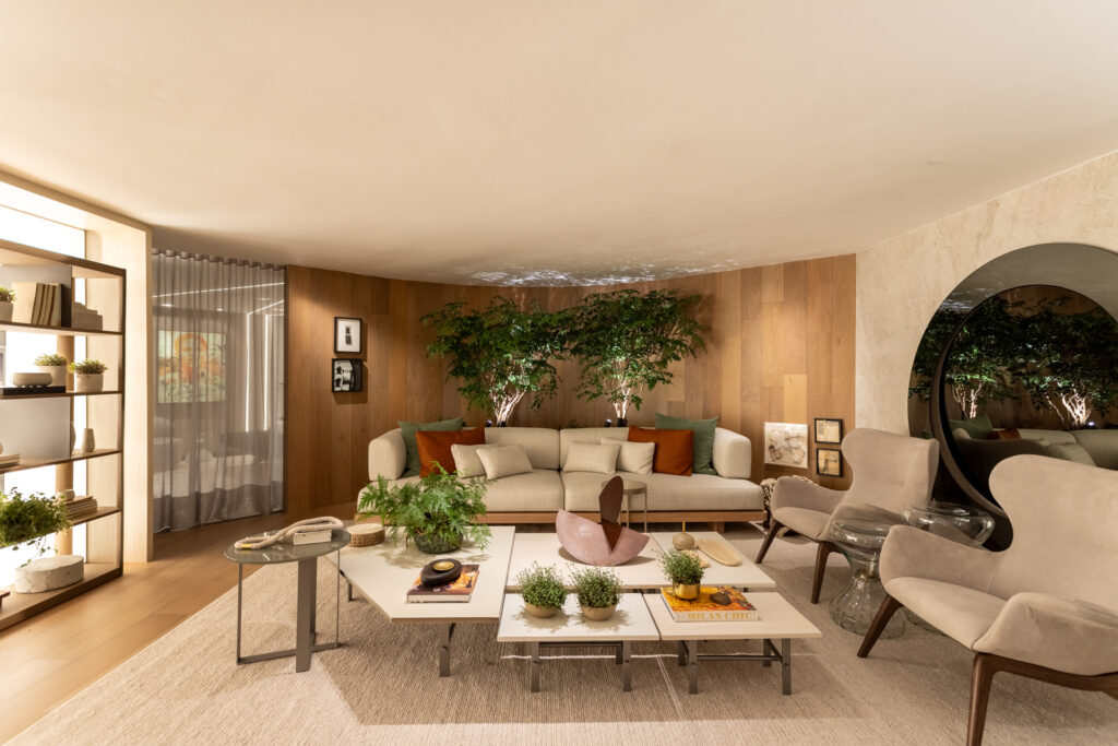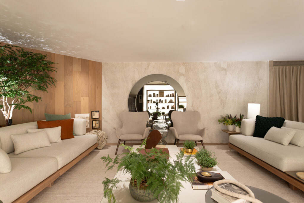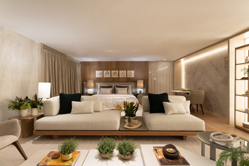 Foi uma honra participar da 8ª Mostra Artefacto, assinando um ambiente que traduz o tema “Meu Lugar” em uma experiência de acolhimento. Nossa proposta foi criar uma suíte integrada ao living, priorizando materiais naturais como madeira, mármore, linho e algodão, que intensificam a sensação de conforto visual e tátil. O espaço foi pensado como refúgio intimista, capaz de unir funcionalidade, estética e bem-estar. Para dar um toque de personalidade, homenageamos a cantora Ana Clara, representando o desejo de encontrar um lugar de pausa após a intensidade da vida. Um ambiente que equilibra poesia e contemporaneidade, reafirmando a essência da Rocha Andrade Arquitetura.