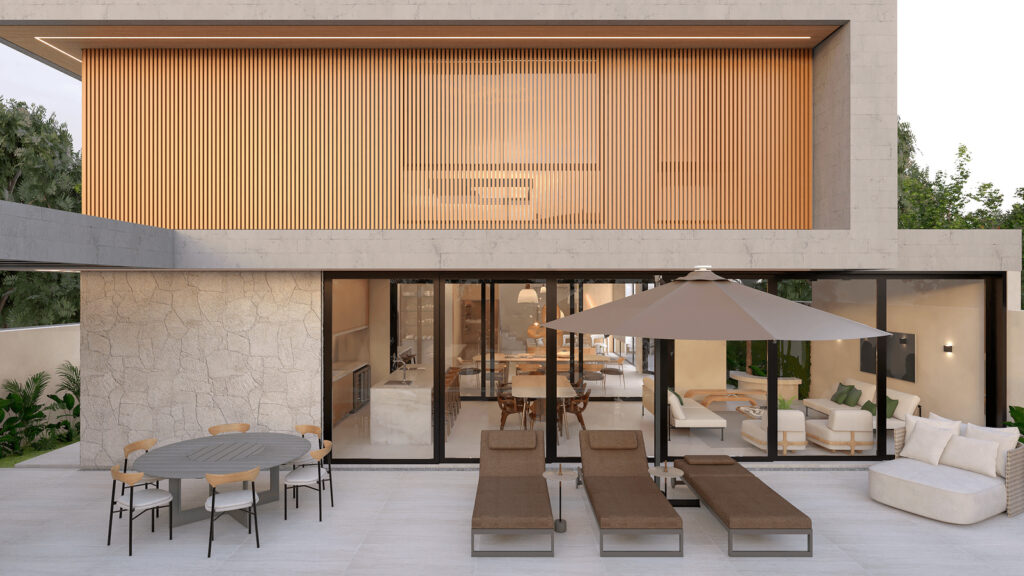 Com grandes vãos, portas de correr e integração total entre interior e exterior.